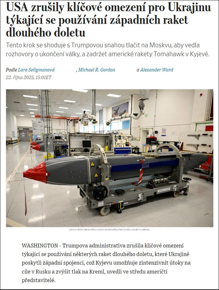 -Zbraně dlouhého doletu. Co si vy osobně myslíte o těch zdánlivě protichůdných signálech, které přicházely z Washingtonu den předtím? Washington Post, Wall Street Journal uvedly, že USA zrušily klíčové omezení použití těchto zbraní. Pak Trump řekl, že Tomahawky nakonec nebudou dodány. A právě před hodinou Zelenský zase říká, že Ukrajina dostane zbraně, které téměř zasáhnou na tři tisíce kilometrů. Je to podle vás už eskalace?