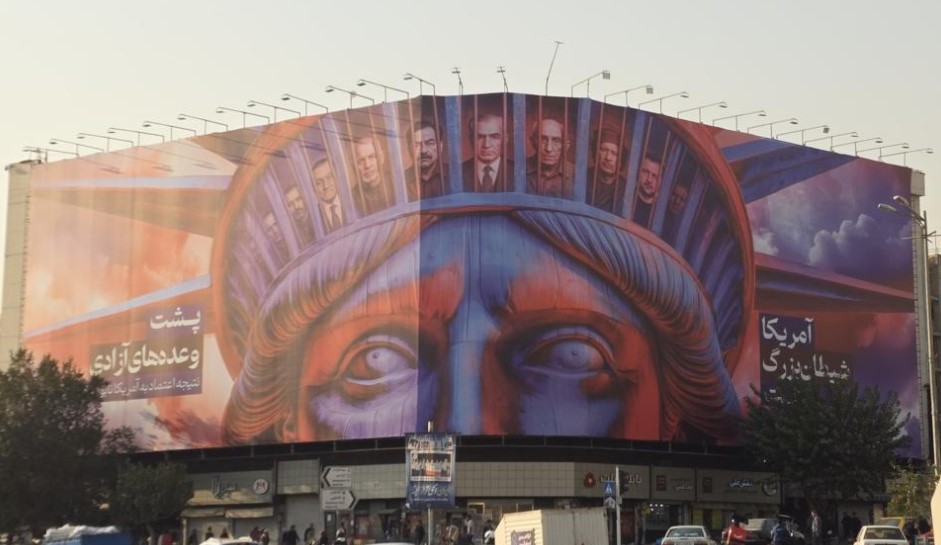 Obrovský transparent na náměstí Enghelab, jednom z nejdůležitějších teheránských náměstí, zobrazuje bývalé hlavy států a vlád, které ztratily moc nebo zemřely kvůli své důvěře ve sliby Washingtonu. „Důvěra v USA je smrtelná,“ hlásá transparent.