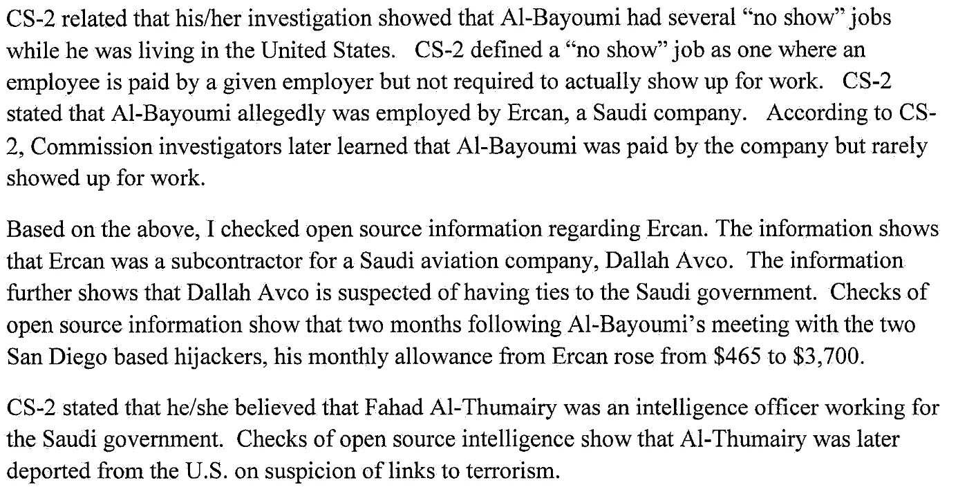 Před svým propuštěním Lesemanovo vyšetřování odhalilo, že Bayoumi během svého pobytu v USA zastával několik „nedostavitelných“ zaměstnání – „kde zaměstnanec dostává mzdu od konkrétního zaměstnavatele, ale ve skutečnosti se do práce nemusí dostavit“. Jedno z těchto „fiktivních zaměstnání“ bylo u saúdské společnosti Ercan, jejíž kanceláře „navštěvoval jen zřídka“. Záznamy uvádějí, že dva měsíce po Bayoumiho setkání s Hazmim a Midharem se jeho měsíční plat v Ercanu zvýšil ze 465 dolarů na 3 700 dolarů.