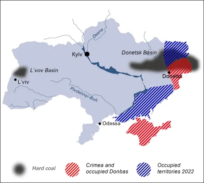 Ukrajině i po válce, pokud tedy Rusové nevezmou Ukrajině celý východní břeh Dněpru, zůstanou k dispozici dvě obrovské uhelné pánve zobrazené níže na obrázku, a to západní část Doněcké pánve, která zasahuje hluboko na západ mimo geografickou oblast Donbasu na východě, a rovněž Lvovská pánev na západě Ukrajiny. Z memoranda totiž vyplývá, že v důsledku války a úvěrů bude Ukrajině umožněno splácet úvěry tím, čeho Ukrajina bude mít nejvíc, a to právě uhlím. To však vyžaduje, aby byla po tomto uhlí v EU vytvořena poptávka.
