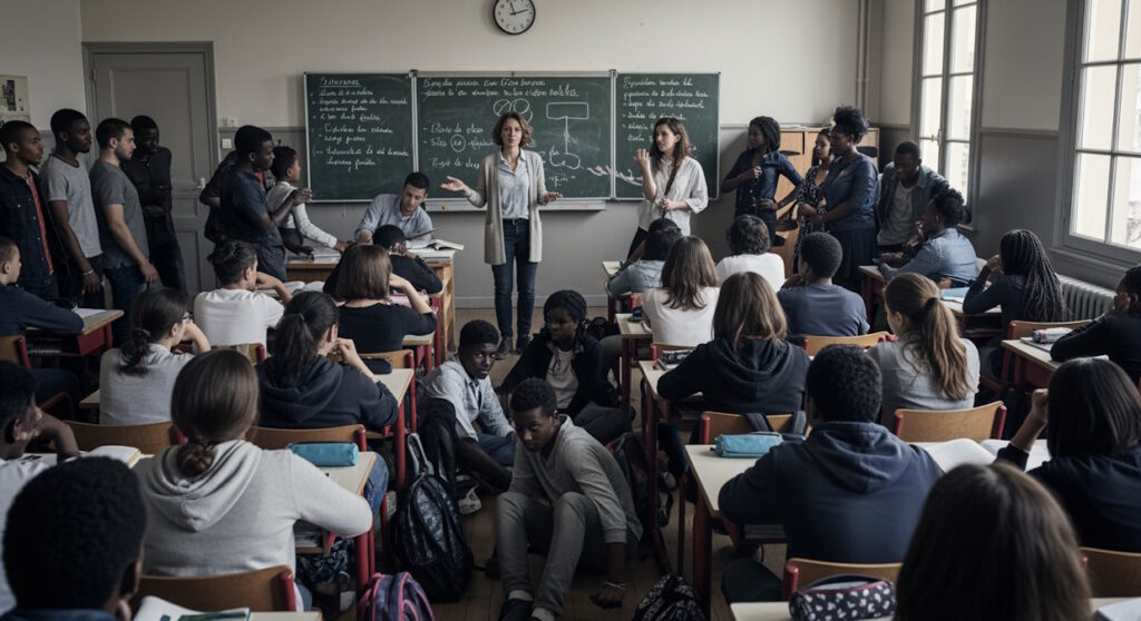 Toto napětí je více než patrné ve školách v tzv. prioritním vzdělávání, tedy v regionech, které se již léta potýkají se sociálními, ekonomickými a bezpečnostními problémy. Imigrace je zde koncentrována, míra osvojování jazyků je tam nejnižší a autorita ve třídě se hroutí nejdříve tam. Učitelé francouzštiny jednomyslně uvádějí, že jejich denní režim zahrnuje méně času výukou než řízením, kompenzací a stabilizací. Na mnoha místech lze výuku přesněji popsat jako permanentní krizové řízení.