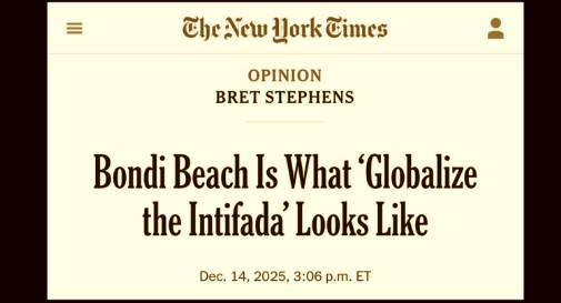 Válečný štváč New York Times Bret Stephens napsal článek s názvem „ Bondi Beach je výsledkem globalizace intifády “, ve kterém tvrdil, že střelci „brali vážně slogany jako ‚odpor je oprávněný‘ a ‚za všech okolností‘, které jsou všudypřítomné na protiizraelských demonstracích po celém světě“.