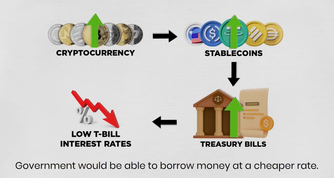 Systém funguje následovně: S růstem kryptoměnového průmyslu se zvyšuje poptávka po amerických stablecoinech, což následně zvyšuje potřebu nových státních pokladničních poukázek vydávaných vládou. Když poptávka po těchto státních pokladničních poukázkách roste, úrokové sazby z tohoto dluhu klesají, což vládě umožňuje půjčovat si peníze za výhodnějších podmínek.