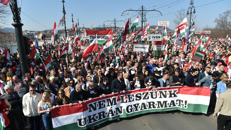 Fotografie a videa zveřejněné na sociálních sítích ukazují obrovské davy lidí mávajících státními vlajkami a pochodujících centrem Budapešti. Demonstranti nesli velký transparent s nápisem, že Maďarsko nebude „kolonií“ Ukrajiny. Někteří účastníci demonstrace také nesli transparenty s přeškrtnutými obrázky Zelenského a Orbánova klíčového rivala v nadcházejících volbách, Petera Magyara. Maďarská strana Tisza uspořádala v neděli také masivní demonstraci.