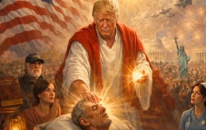 V neděli večer 12. dubna 2026 zveřejnil americký prezident Donald Trump na sociální síti Truth Social obrázek sebe sama jako Ježíše Krista, jak uzdravuje nemocného. Zdá se, že to posunulo evangelikální náboženský klam, který doposud vnímal Trumpa jako Ježíšova zástupce, jehož úkolem je porazit síly zla na Zemi a připravit tak tělesný návrat Ježíše Krista, na novou úroveň.