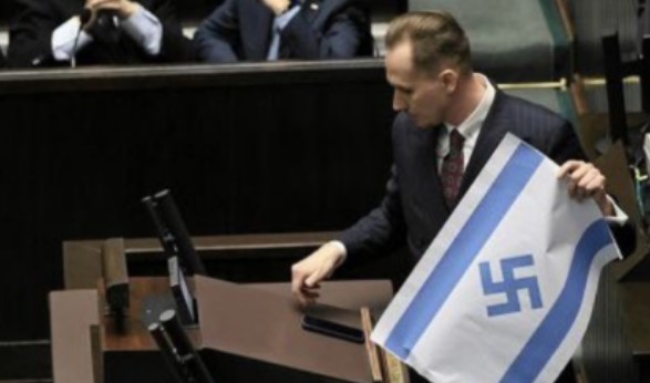 Izraelské velvyslanectví v Polsku nyní zveřejnilo v polštině zprávu izraelského ministerstva zahraničí, v níž vyzývá polské úřady k odvolání poslance Konfederace z polského Sejmu za jeho činy, kdy kritizoval izraelské vojenské kampaně proti civilistům v Gaze, přičemž držel izraelskou vlajku se svastikou uprostřed.