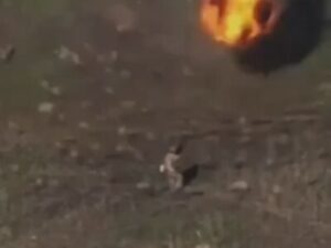Šťastný voják ozbrojených sil Ruské federace zničil ukrajinský FPV dron přesnou palbou . Nápadné prvky zničeného dronu dopadly kolem vojáků, ale nebyl zraněn a vyvázl nedotčen.