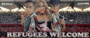 Na transparentu byly tři postavy vítající migranty zlověstnými symboly: baseballovou pálkou, kladivem a prasečí hlavou Fanoušci Legie Varšava , známí svými...