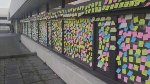 K sobotnímu ránu byla budova NOS (veřejnoprávního média) zaplněna 14 445 plakáty. Každý post-it představuje jedno úmrtí v roce 2022. Před...