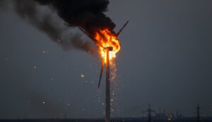 Tyčící se, černé oblaka kouře, hořící trosky padající jako ohnivé koule – a nakonec z větrné turbíny zbyde jen obrovská...