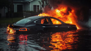 Pokud se hybridní a elektrická auta v důsledku záplav dostanou do kontaktu se slanou vodou, stává se to extrémně nebezpečné:...